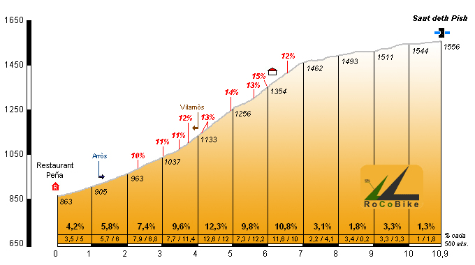 | Altitud: 1556 m | Desnivel: 693 m | Longitud: 10.90 km | % máx: 15 % | % medio: 6.4 % | Coeficiente: 194 |