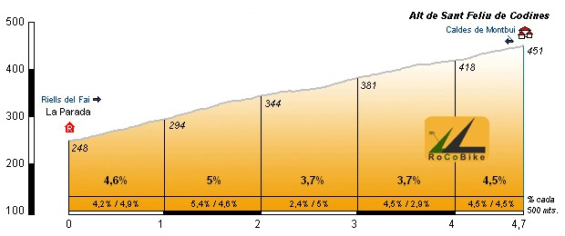 | Altitud: 451 m | Desnivel: 203 m | Longitud: 4.70 km | % máx: 8 % | % medio: 4.3 % | Coeficiente: 27 |