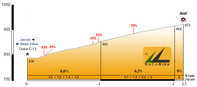 | Altitud: 973 m | Desnivel: 137 m | Longitud: 2.10 km | % máx: 13 % | % medio: 6.5 % | Coeficiente: 26 |