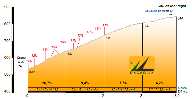 | Altitud: 844 m | Desnivel: 314 m | Longitud: 3.90 km | % máx: 19 % | % medio: 8.1 % | Coeficiente: 87 |