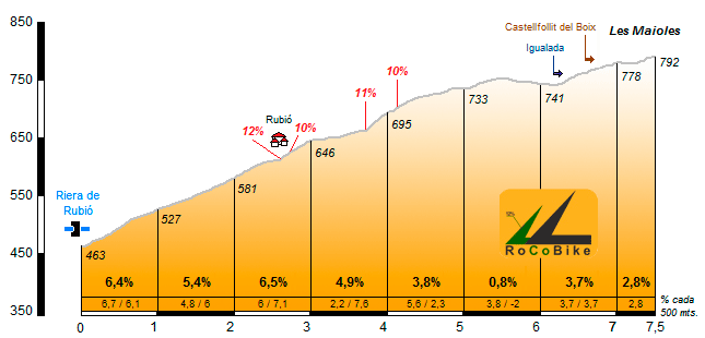 | Altitud: 792 m | Desnivel: 329 m | Longitud: 7.50 km | % máx: 12 % | % medio: 4.4 % | Coeficiente: 52 |
